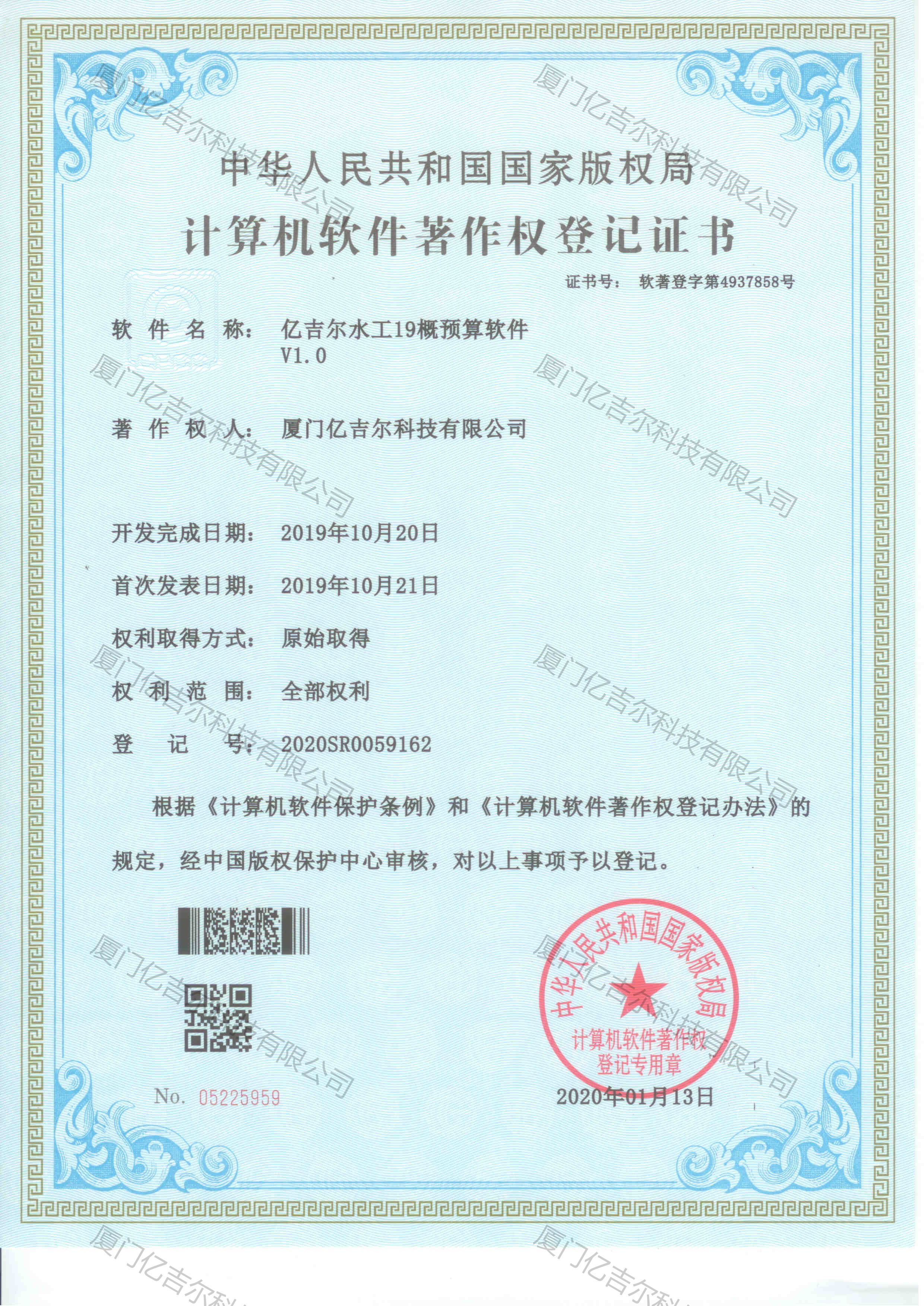 億吉爾水工19概預(yù)算軟件著作權(quán)登記證書(shū) 發(fā)布日期:2020年01月13日 瀏覽次數(shù):3702 關(guān)鍵字: 公司 1/1億吉爾水工19概預(yù)算軟件著作權(quán)登記證書(shū)