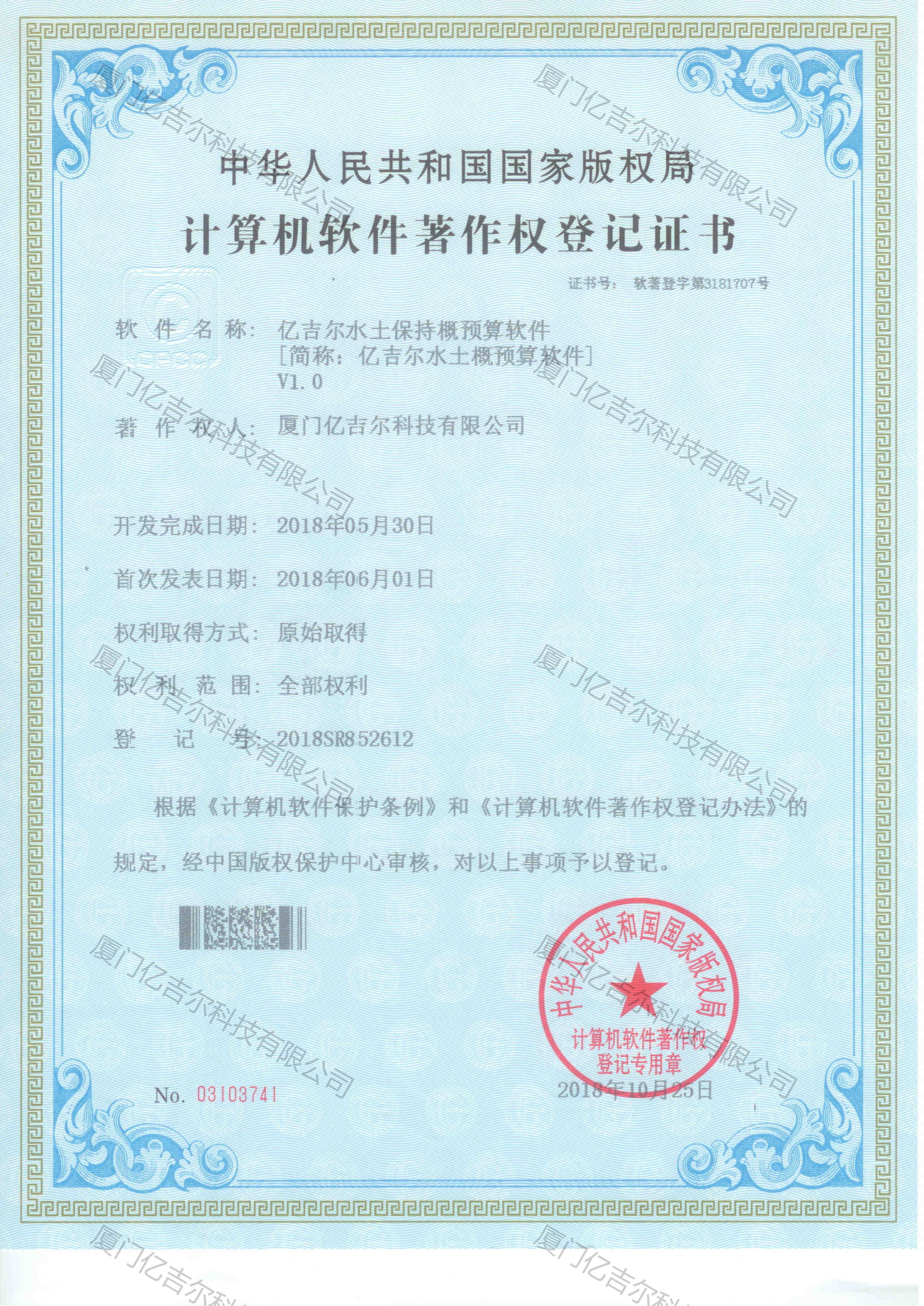 億吉爾水土保持概預(yù)算軟件著作權(quán)登記證書 發(fā)布日期:2018年10月25日 瀏覽次數(shù):3576 關(guān)鍵字: 公司 1/1億吉爾水土保持概預(yù)算軟件著作權(quán)登記證書