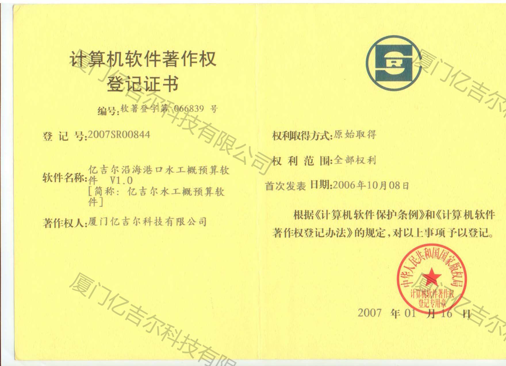 億吉爾沿海港口水工軟件著作權(quán)登記證書 發(fā)布日期:2007年01月16日 瀏覽次數(shù):3373 關(guān)鍵字: 公司 1/1億吉爾沿海港口水工軟件著作權(quán)登記證書